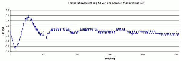 Abweichung der jede Sekunde gemessenen Temperatur von der Geraden 5°/min.