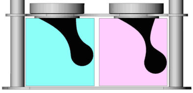 Dieses Bild zeigt die beiden Auswertebereiche der Videokamera für die linke und die rechte Probe mit zwei Beispielen von extremen Probenformen. Die Längenerkennung arbeitet dabei ebenso sicher und genau, wie bei frei durchfallenden Messkugeln.